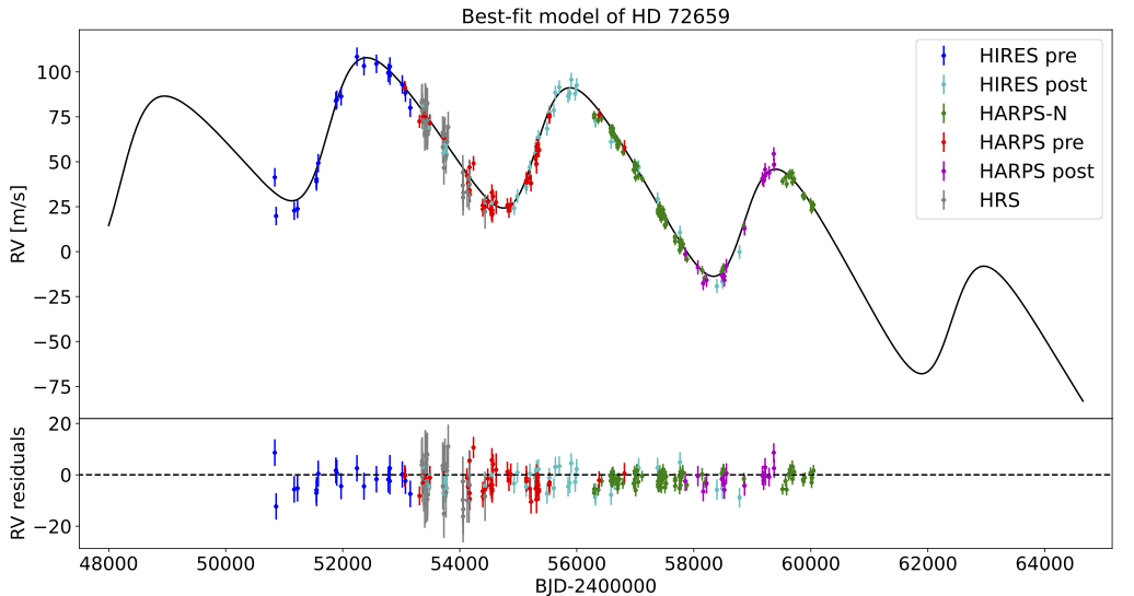 Best-fit model for HD 72659 obtained using two Keplerian terms. More information in the paper.