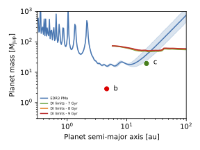 Upper limits in mass for the long-period substellar companion of HD72659 derived from SPHERE observation and PMa sensitivity curves calculated following Kervella et al. (2022). The positions of planet b (from RVs only) and planet c (as derived from our RV+astrometry analysis) are also shown. More information in the paper.